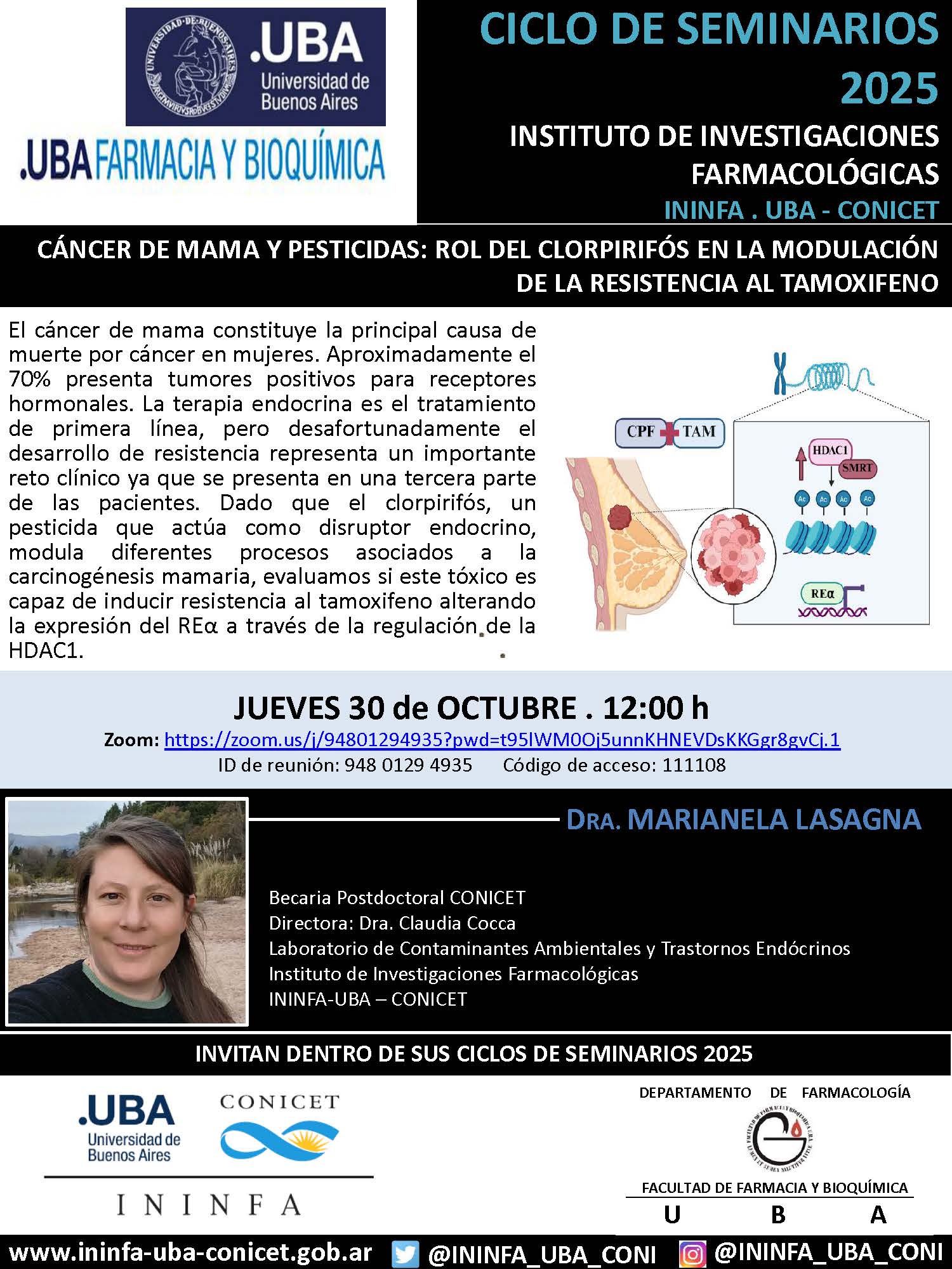 Dra. MARIANELA LASAGNA. Becaria Postdoctoral CONICET, Directora: Dra. Claudia Cocca, Laboratorio de Contaminantes Ambientales y Trastornos Endócrinos, Instituto de Investigaciones Farmacológicas, ININFA-UBA – CONICET.