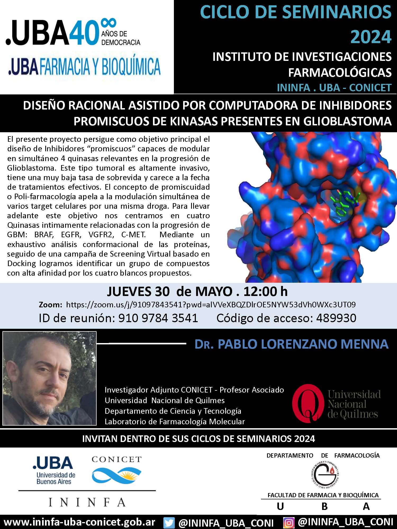 Dr. Pablo Lorenzano Menna. Investigador Adjunto CONICET, Profesor Asociado Universidad Nacional de Quilmes, Departamento de Ciencia y Tecnología, Laboratorio de Farmacología Molecular.